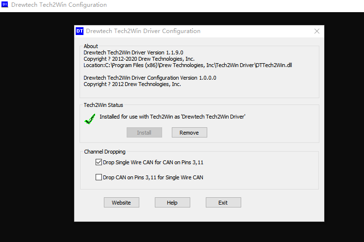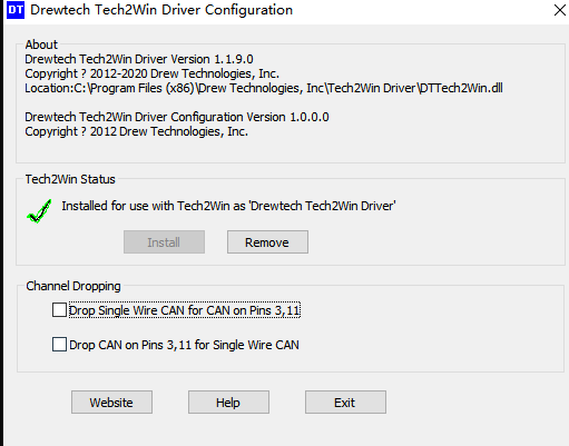 4.Install Drewtech Tech2Win Configuration Tool,Run the tool with ADMIN access,and unchecked box on “Drop Single Wire for CAN on Pins 3,11”.Default is under checked .