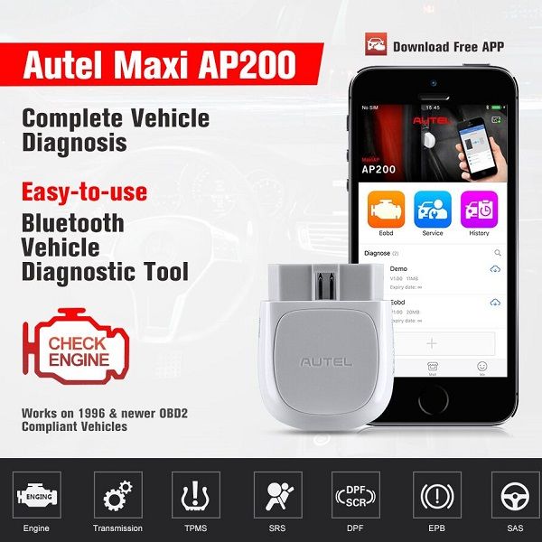 Autel AP200, as an innovative OBD2 scanner, equipped with its own App -“Maxi AP200”, complete OBD2 functions, along with various reset services.
