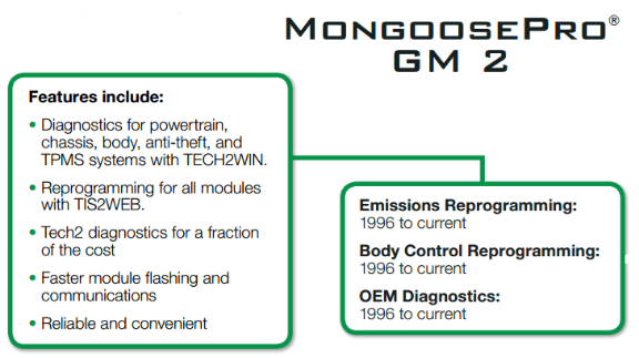 Mongoose Pro GM II support of GDS2 (global diagnostic system 2), SPS (service programming station), Tech2Win, and TIS2000/Global TIS programmer.